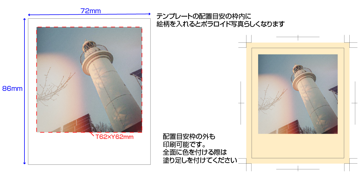 テンプレートに絵柄の配置目安枠があるため、その中に絵柄を入れるだけで簡単にポラロイドらしくなります。