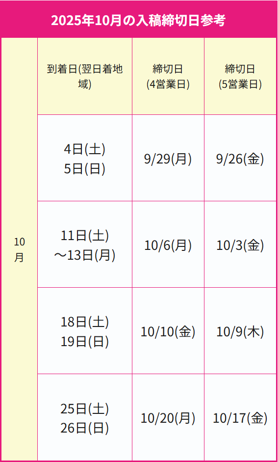 2025年10月の入稿締切日参考 | |||