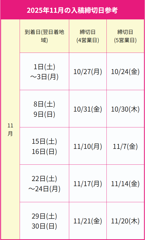 11月 | 到着日(翌日着地域) | 締切日 (4営業日) |
