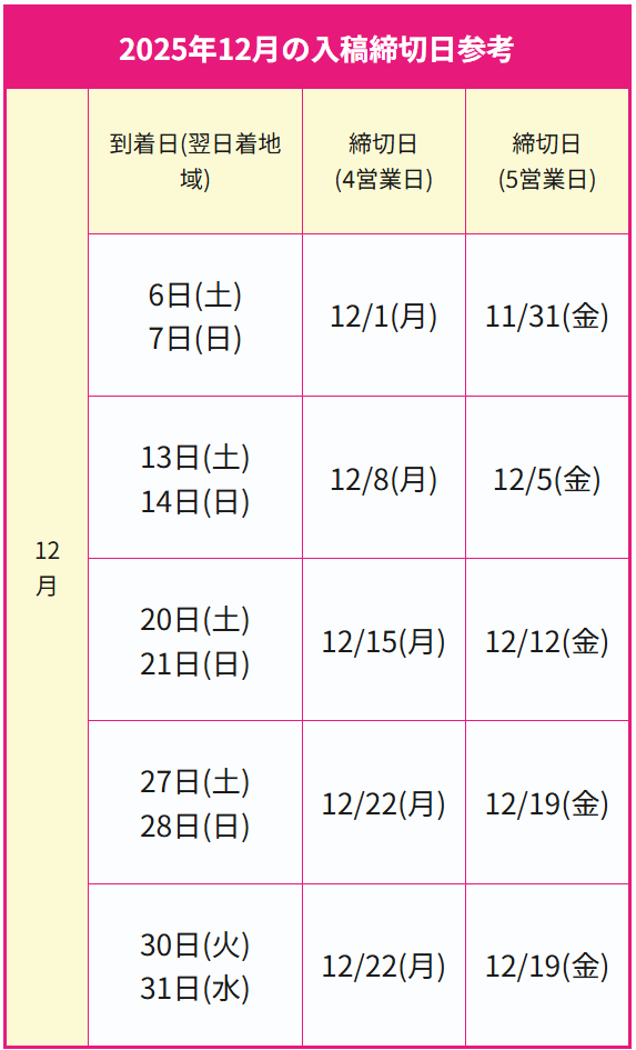 | 2025年12月の入稿締切日参考 | |||
