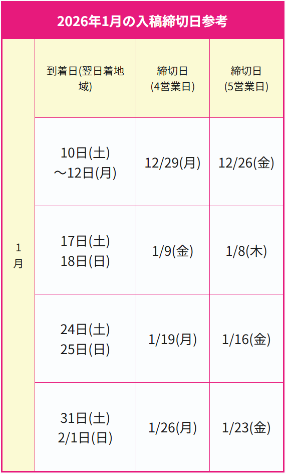 | 2026年1月の入稿締切日参考 | |||