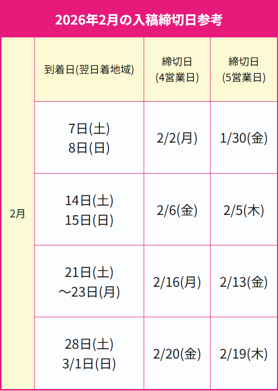 | 2026年2月の入稿締切日参考 | |||