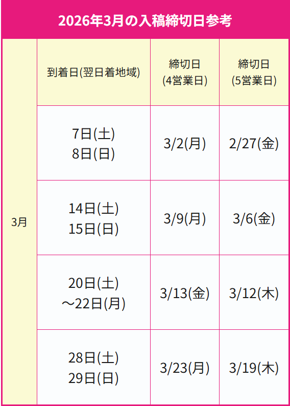 | 2026年3月の入稿締切日参考 | |||